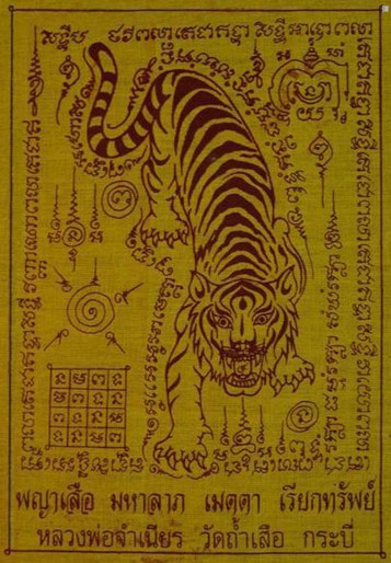 Khăn phù Nàng kêu tình – Riek = kêu hay gọi, Rak = tình yêu. Nàng một tay cầm nữ trang và tiền, một tay cầm vật gì, không rõ hình, để gần âm hộ. So với hình trên, khăn phù của Ajarn Ming, tuy có khác, nhưng có lẽ chỉ là một. Hình phù của Ajarn Min, Nang rub cầm lỏ lường để gần âm hộ. Có lẽ bùa Ajarn Min hiệu nghiệm hơn vì có âm linh. Các phù trên khăn này thường thấy vẽ cho các bùa tình ái. Hình như phía dưới hết là tên phù và số thứ tự của bùa.