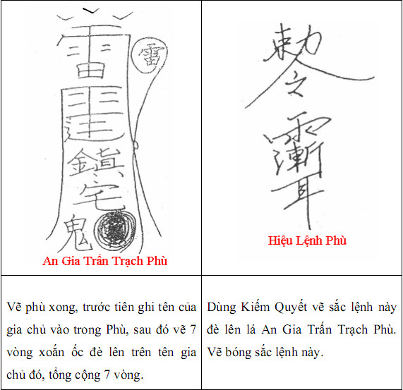 Chân ngôn niệm 3 lần xong, chân đứng Cương Bước, tay trái chắp Lôi Quyết, đặt vào eo trái, tay phải chắp Kiếm Quyết đối chuẩn với “ Trấn Trạch An Gia Phù ” để thư hiệu lệnh phù, hoàn thành việc thi hành pháp.