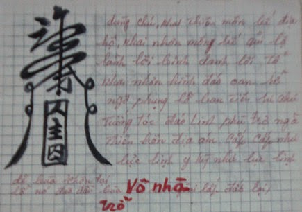 Chú : Khai Thiên môn , bế địa hộ , khai nhân mông, bế ám quỷ lộ. Lãnh lôi binh, danh lôi tổ. Khai nhân hình đáo oan nợ. Ngô phụng Lô ban tiên sư , chư tướng tốc đáo linh phù trợ ngã. Thiên hôn địa ám- cấp cấp như luật lệnh – y kỳ như lực lệnh.