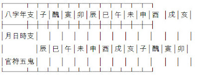 2、流年犯五鬼官符者,即運用五鬼運財法那一年之流 年,正好逢十二歲君之五鬼凶煞管轄之年。先由八字中的生月與生時,求出自身之命宮。再由命宮對照流年之支字即可得知該年,是五鬼、太陰、天狗、白虎……並 何星管轄主事,即所謂年犯太歲,年犯五鬼,年犯白虎……