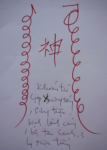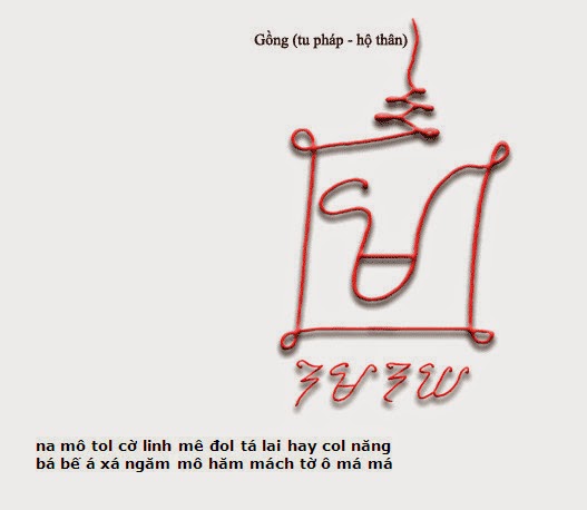 Á mách Phật chiếu , anh ru hắc nưng hắc , xê hết xê mắc mô bồ tía ca quít ba tu tha qua ca mắc mắc . Nam mô Đức Phật , Đức Tổ , Đức Thầy , 136 vị Lục Tổ , Tây Phương Phật độ cho con :