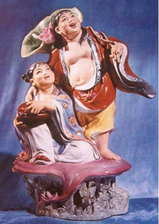 寒山聽說拾得千里迢迢而來,想必腹中饑餓,急忙從房中捧出一隻盛著素餅的竹編食盒。二人相見,寒山送盒,拾得獻荷。從此傳為佳話,後人把捧荷的拾得稱為“和”(諧音),把捧盒的寒山稱為“合”,兩人合稱為“和合二仙”。