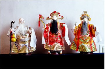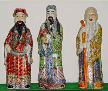*Trong dân gian thì người ta hay thỉnh ba tượng Phước-Lộc-Thọ được tạo bằng nhiều chất liệu, kích cở … khác nhau , mang đến các Đạo Quán nhờ giúp cho việc “Khai Quang” rồi đem về thờ tại nhà, cầu xin ba Ngài ban bố cho cả gia đình đều “có phước, được lộc và trường thọ”.