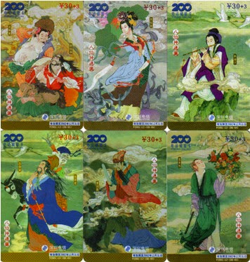 Trương Quả Lão thả Lừa giấy, Lữ Ðồng Tân thả Ống tiêu, Lam Thể Hòa thả Ngọc bản, Hàn Tương Tử thả giỏ Hoa lam, Tào Quốc Cựu thả Thủ quyển, Hà Tiên Cô thả Bông sen.