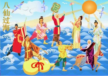 Tất cả Bát Tiên đều đứng trên bửu pháp của mình, giống như đứng trên thuyền, đồng vượt qua Ðông hải.