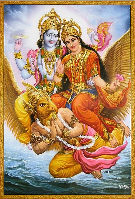 Vishnu, Laksmi và vật cưỡi của thần là Garuda (đại bàng kim sí điểu) – con chim thần huyền thoại.