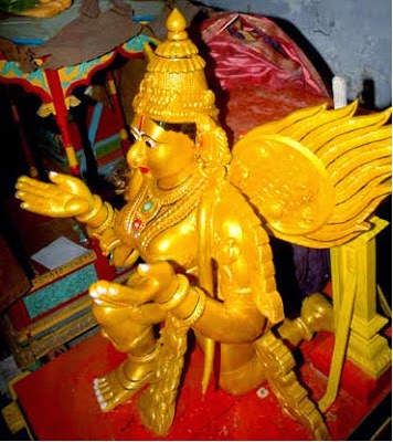 Kinh Veda nói đến Garuda sớm nhất, dù dưới cái tên Syena, vùng đất nơi con chim to lớn đã mang rượu tiên/ mật hoa từ thiên đường xuống trái đất. Trong chuyện thần kỳ Ấn Độ, ra đời sau đó, cũng đề cập đến Garuda thực hiện một việc tương tự, nhưng nó được định danh là Dyena (từ tiếng Phạn để chỉ chim đại bàng) và Garuda cũng có hành vi tương tự. Một trong những bộ mặt của Sri Pancamukha Hanuman/ Hanuman năm mặt là Mahavira Garuda. Đó là mặt chỉ về hướng Tây. Việc thờ cúng Garuda được tin là sẽ đẩy lùi mọi ảnh hưởng/ tác động của chất độc ra khỏi cơ thể. Ở vùng Tamil Vaishnavism, Garuda và Hanuman đều được biết dưới tôn danh là Periya Thiruvadi và Siriya Thiruvadi.