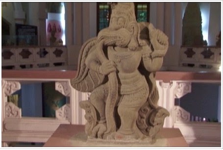 "Trong Hindu giáo, Garuda là một vị thần, và thường là vật cưỡi của thần Vishnu. Garuda được miêu tả có một thân hình tráng kiện, vàng rực ánh kim của một người đàn ông với mặt trắng, cánh đỏ, mỏ đại bàng và mũ miện trên đầu. Vị thần cổ xưa này thật to lớn, đồ sộ đến nỗi che khuất cả mặt trời.