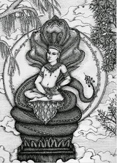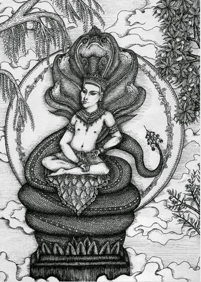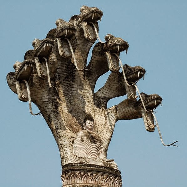 Rắn thần Naga bảo vệ Đức Phật, một biểu tượng quen thuộc ở một số vùng văn hóa Phật giáo châu Á như Ấn Độ, Campuchia.