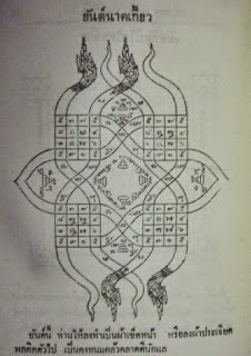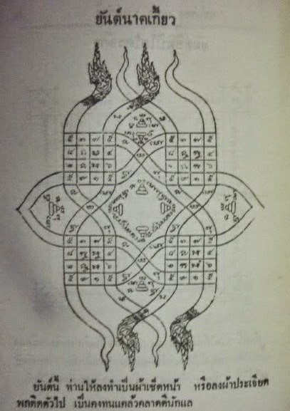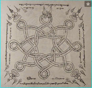Hình 1: Hình rắn thần quấn lại ngậm đuôi tạo thành bùa bát phương, xung quanh có tứ trấn và chú ngữ pali chạy vòng thành hình vuông.