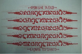 Gu Ti Gu Ya Tha Saa Wae Taa Saa Gu - Gu Gu Ti Saa Tha Ya Gu Saa Taa Wae. Hoặc thậm chí Gu Gu Ti Gu Gu Tiya Tha Saa Saa Tha Ya - Wae Taa Saa Gu Gu Saa Taa Wae. Câu thần chú được tìm thất trong Khom (một phiên bản của Pali Phạn ở cambodia cổ, conbsidered là thánh thiêng của các nhà sư Phật giáo ở Thái Lan) .