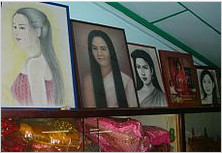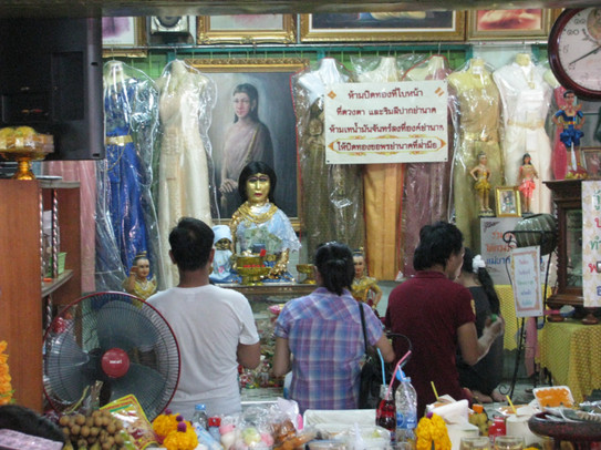Các vật phẩm ở trong đền: Tranh ảnh và quần áo của Mae Nak đặt trong tủ kính.