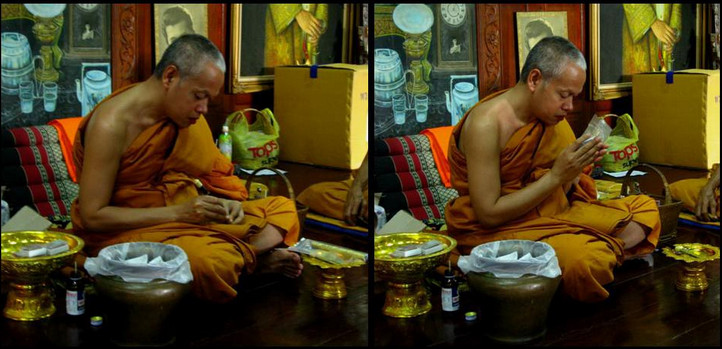 Luang Phu Phad biểu diễn quán đảnh Amulets Garuda . Các bùa hộ mệnh được ban phước lành bởi Luang Por Phad .