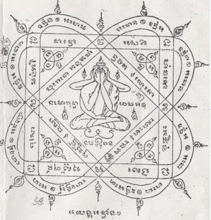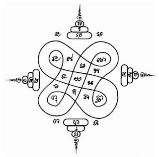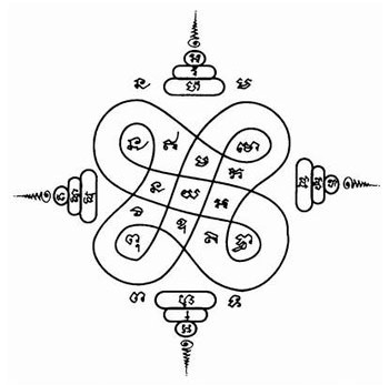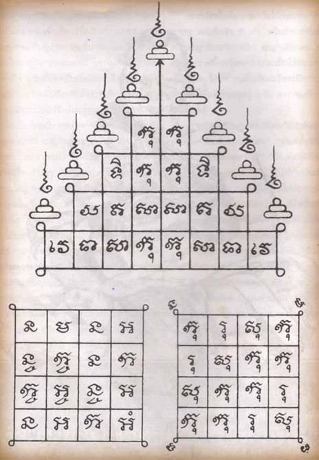 Các hình vuông bên phải được gọi là "Hua Jai Suea" (hổ tâm thần chú) tụng như sau :