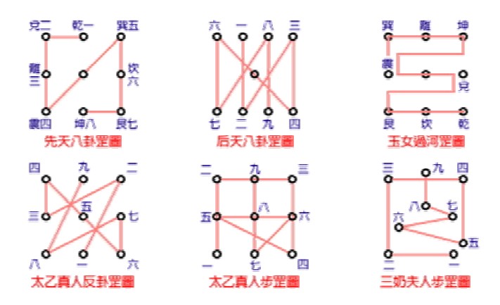 *** Từ trái qua phải gồm các đồ hình sau : Tiên Thiên Bát Quái Cương, Hậu Thiên Bát Quái Cương, Ngọc Nữ Quá Hà Cương, Thái Ất Chân Nhân Hậu Quái, Thái Ất Chân Nhân Bộ Cương, Tam Nãi Phu Nhân Bộ Cương
