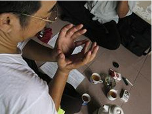 2/ TẨY TAY : Bắt ấn , chọc ngón tay áp út phải vào ly nước , vừa đọc vừa vẽ ba vòng tròn vào bàn tay trái . Sau đó xoa hai tay , xoa lên mặt .