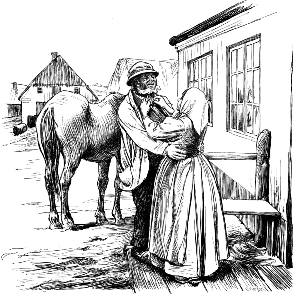 Ông lão vui vẻ dẫn theo hai người khách lạ về nhà. Khi nhìn thấy ông lão, vợ ông vui mừng đến nỗi không để ý tới túi táo còi trên tay ông và cả hai người đi cùng. Sau đó, ông lão đã kể tường tận lại cuộc trao đổi của mình cho bà lão nghe.