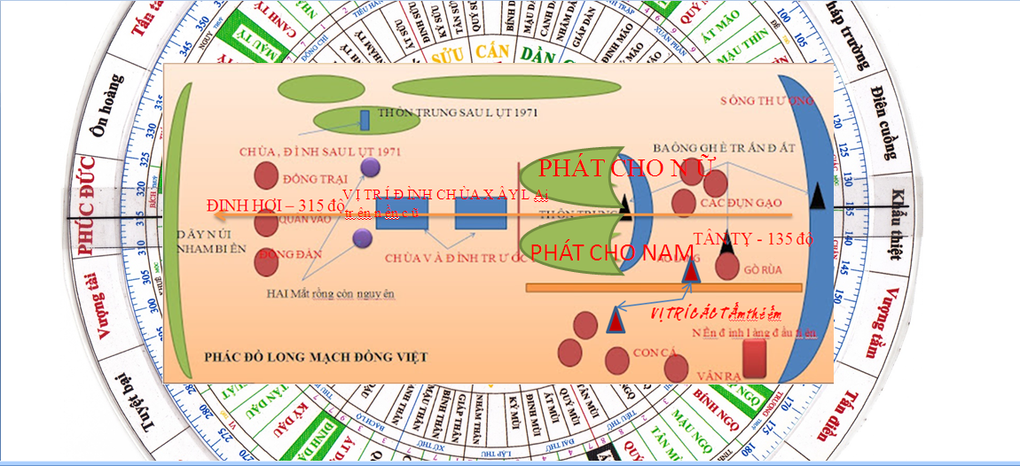 1/ Về Long mạch và Huyệt kết phát : Khu vực khoảng 5-7 ha có giới hạn từ ao làng đến sau hậu cung của đình đang xây dựng, chiều ngang khoảng 200 m có kết tụ 01 Huyệt chính và 03 Huyệt bàng.Theo chiều nhìn từ sông về phía đình + Chùa, bên tay phải thuộc về Bạch Hổ sẽ phát cho nữ. Phía bên này có 01 Huyệt Bàng phát mạnh về Đinh, Tài, rất mạnh. Phía bên trái thuộc Thanh Long có 02 Huyệt Bàng phát đến tứ trụ triều đình. Hai Huyệt này Khí lực rất sung mãn, và do Long không đi trên mặt đất nên không bị tác động của sự tàn phá của con người, do vậy ta có thể thấy sự trường tồn của những Long Huyệt này. Huyệt chính hình Oa, mang tính chất Dương Huyệt, hình thể mặt cắt dọc của Huyệt trông giống như cái tai của con người với vành tai xoè rộng và phần nhĩ tai sâu hun hút xuống phía dưới và Khí lực từ dưới đẩy lên hùng mạnh, bất tận như sóng Trường Giang - Đại Hải.Đánh giá của dienbatn thì Huyệt này thật là bất khả tư nghì. Tuy nhiên cũng cần nói rõ thêm là Huyệt này chỉ giành riêng cho những bậc Đế Vương có đủ Phúc đức của Tổ tiên , dòng họ. Những gia đình kém phúc, chẳng may hay cố tình đặt mộ hoặc Từ đường vào đây sẽ gặp những hậu quả thật đáng tiếc. Nói nôm na một cách dễ hiểu, nếu phúc đức của dòng họ mới chỉ là điện thế 110v hay 220 v thì Khí lực của Huyệt này là 500 Kv. Riêng khu vực Đầu Long có hai mắt Long như đã viết ở phần trên, nếu được nạo vét, sang sửa lại cho hoàn chỉnh sẽ là một nơi Đắc địa với Khí lực xung mãn, giành riêng để làm Đình - Chùa thờ cúng sẽ đem lại cho nhân dân trong vùng những phúc phận bất khả tư nghì. Những gia đình , dòng họ phát tâm làm Đình , làm Chùa, tô tượng, đúc chuông, dâng cúng hoành phi câu đối cho Đình - Chùa, chắc chắn sẽ được sự gia trì của Linh Khí núi sông, Hồn thiêng sông núi và các chư vị Phật, Thánh , Tiên , Thần phù độ.