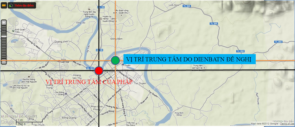 Nhìn trên bản đồ ta nhận thấy rằng, vị trí đặt tòa Công sứ nằm lọt đúng vào vị trí xung sát của sông Cầu. Tại vị trí này, do sức chảy của dòng sông sẽ tạo nên những tia ác xạ bắn thẳng vào tòa Công sứ . dienbatn đề nghị chuyển trung tâm hành chánh của Thái Nguyên nên đặt vào khu vực dòng sông ôm vòng vào thuộc phường Túc Duyên như hình sau.