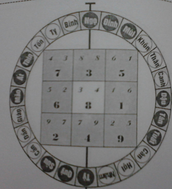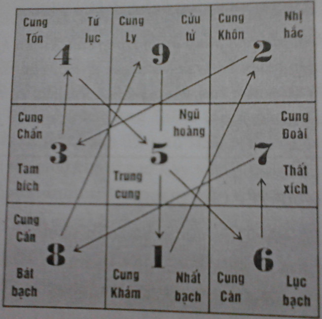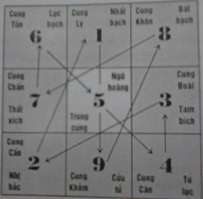 b/ Hướng tinh : Lấy vận tinh đến Hướng nhập Trung cung , ghi nhỏ bên phải rồi dùng số của Lạc thư phối âm hoặc dương để định quỹ đạo thuận nghịch.