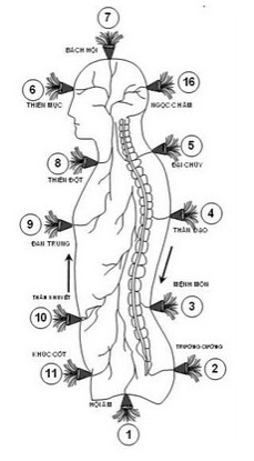 Luân xa 6-16, 7-1, 5-8, 4-9, 3-10, 2-11 mà trong đó các luân xa 6, 7, 5, 4, 3, 2 nằm trên mạch đốc (mạch dương), các luân xa 8, 9, 10, 11 và 1 nằm trên mạch nhâm (mạch âm).