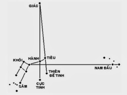 Sao Tiêu gần với sao Giác. Sao Hành dẫn tới chòm sao Nam Đẩu. Sao Khôi dựa vào chòm sao Sâm.