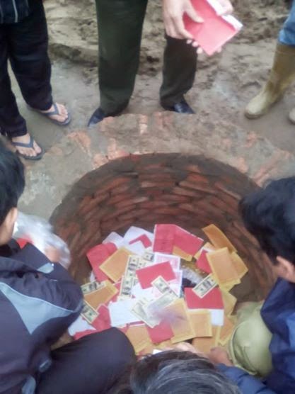 Sau đó người ta mới thực hiện dải tiền Âm và tiền Dương xuống mộ. Một vài nới người ta dải 5 loại đậu ( năm mầu và những đồng xu cổ xuống mộ.
