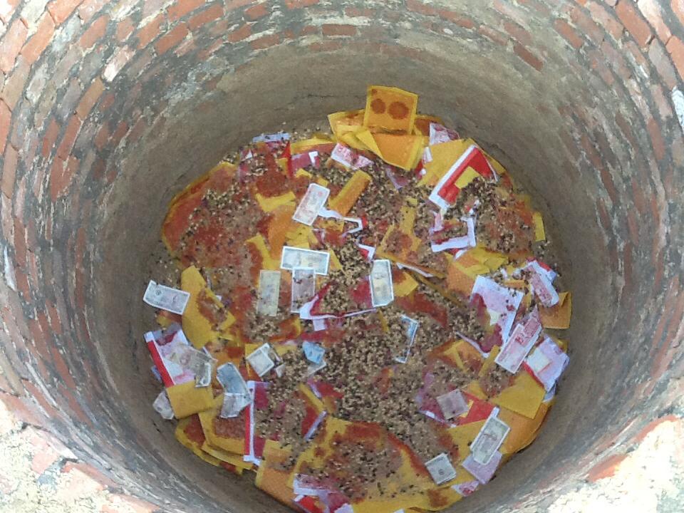 Sau khi làm lễ bồi hoàn Long mạch và Tạ mộ xong hóa vàng tại chỗ . Lưu ý khi đốt vàng mã phải cháy cho hết , cuối cùng đổ một chút rượu trắng vào tro.