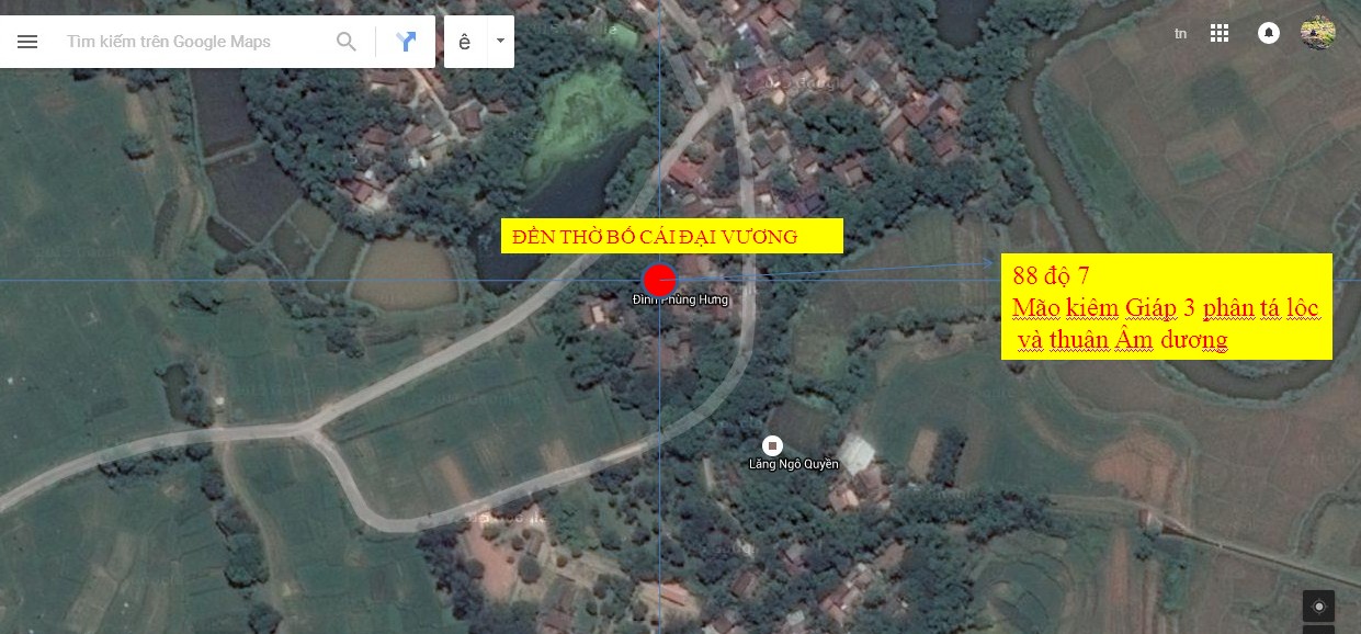 Hướng Đền 88 độ 7 - Tọa Dậu - Hướng mão - Phân kim : Kỷ Dậu - Quý Mão. Mão phải kiêm Giáp 3 phân để tá lộc và thuận Âm - Dương.