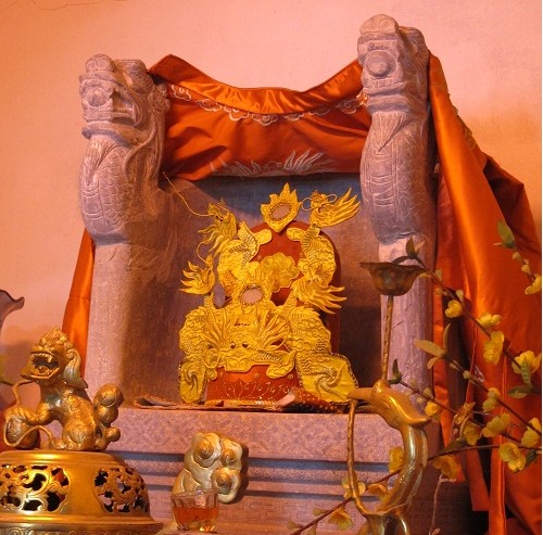 Bàn thờ đá và ngai được nhà vua sắc phong khi xưa vẫn còn nguyên vẹn với những khắc chạm nghệ thuật tinh xảo .