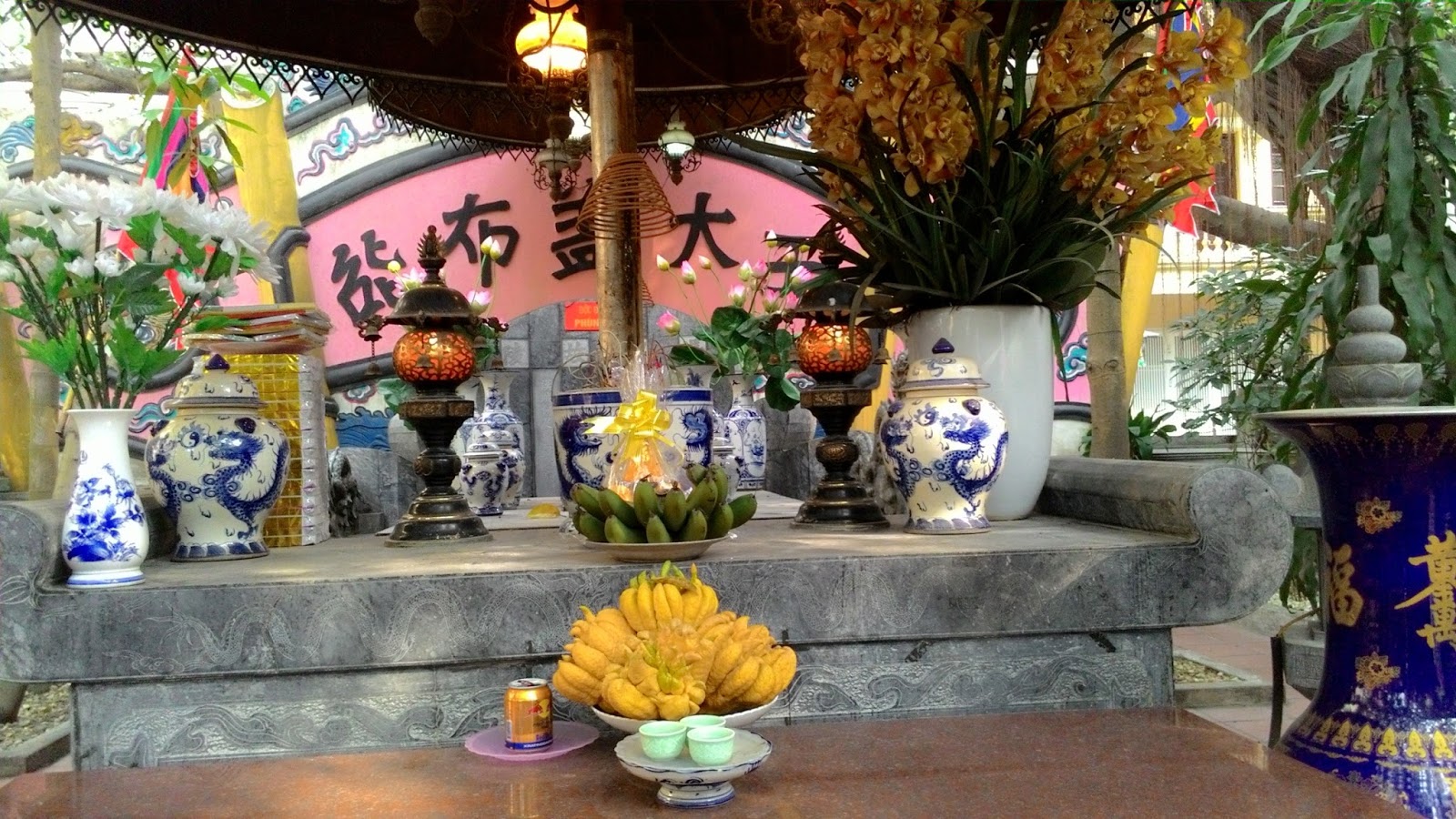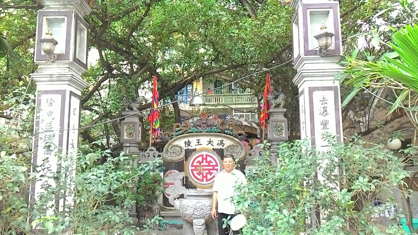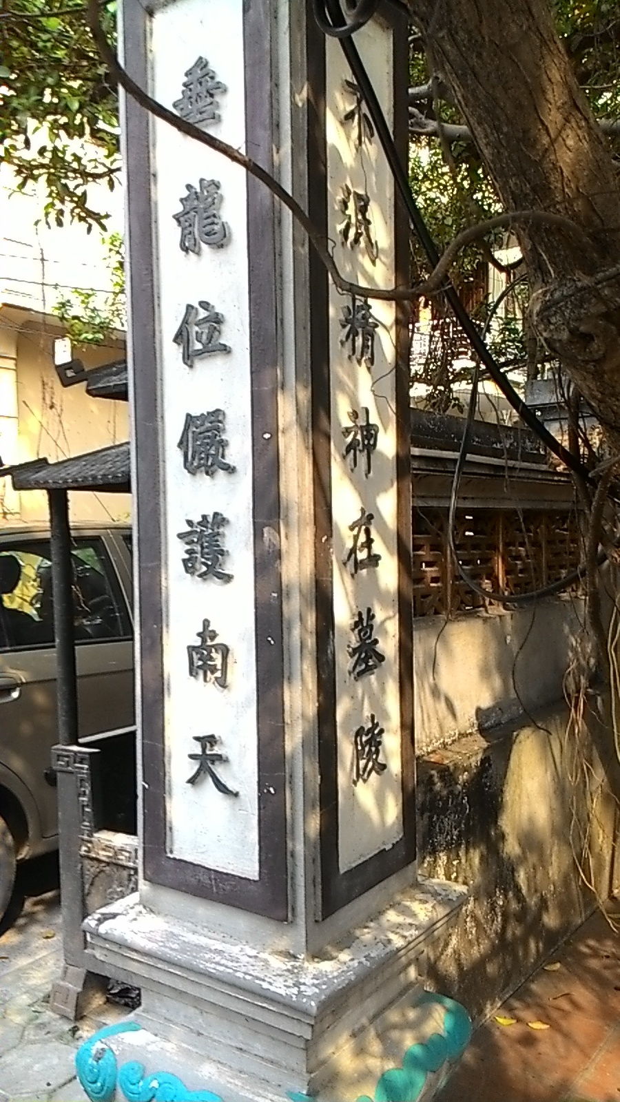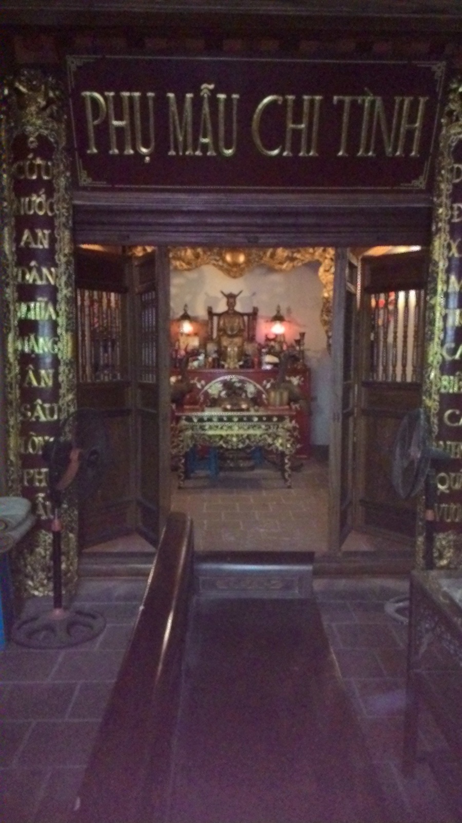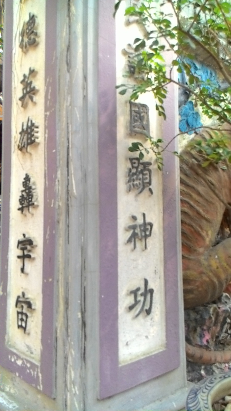 Trước cổng và hai bên có rất nhiều trụ khắc các câu đối .