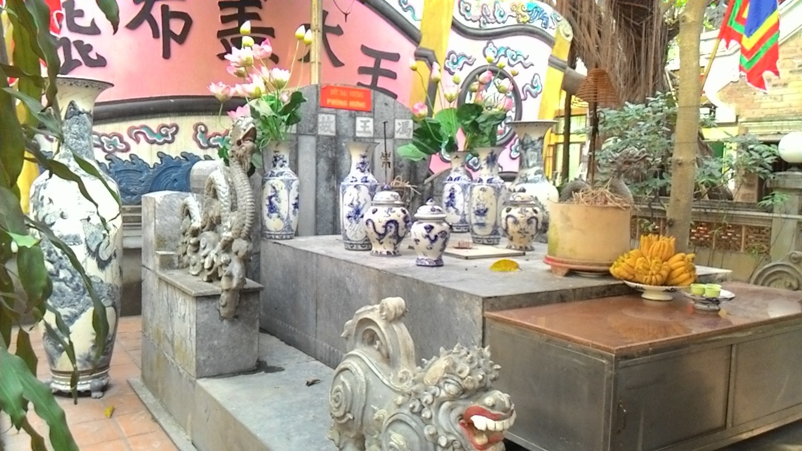 Hai bên phía sau là cặp rồng đang cưỡi trong mây và đằng trước là cặp nghê chạm khắc cầu kì.