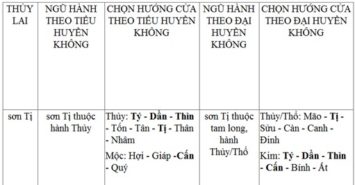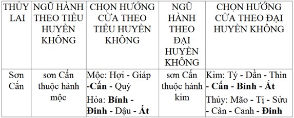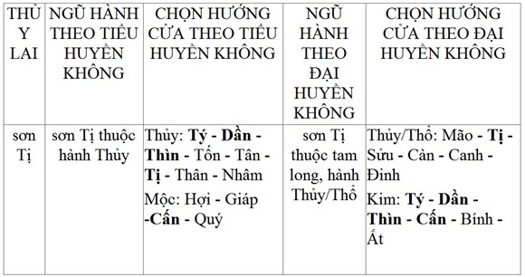 Vậy tổng kết lại chỉ có hai sơn Dần, Tị phù hợp với công vị của thủy lai. Nhưng sơn Dần lại trực thuộc cung Phục vị phía sau nhà, thành ra chỉ có thể thông cửa hậu. Sơn Tị nằm bên hông trái nhà, cố gắng chừa khoảng cách để mở cửa tại sơn tốt này. Giả sử không thể mở cửa tại cung Tị, ta có thể dùng cung Thân của tiểu huyền không để khai môn (vì được cung Sinh khí).
