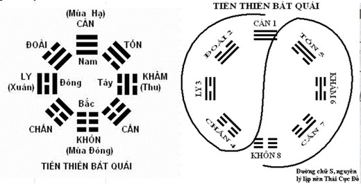 ngày xưa họ Bao Hy làm vua đã làm ra bát quái, lấy gốc từ hà đồ. Tiên thiên bát quái này thứ tự là: Càn (1), Đoài (2), Ly (3), Chấn (4), Tốn (5), Khảm (6), Cấn (7), Khôn (8).