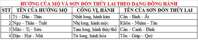 * Thủy: Tý Dần Thìn Tốn Tân Tị Thân Nhâm (thủy lai hành kim sinh cho hướng mộ hành thủy nên tướng khí).