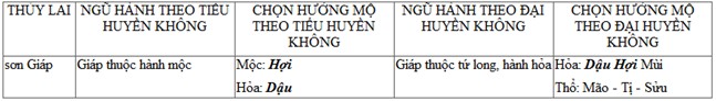 qua phân tích và so sánh hai pháp thức đại/tiểu huyền không, ta có thể lập mộ: tọa Mão hướng Dậu, tọa Sửu hướng Mùi.