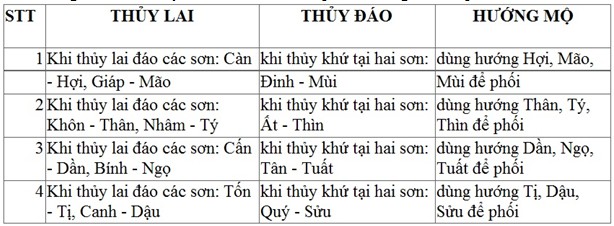 • Thủy khứ phải từ sơn hành hưu tù của hướng ngôi mộ: khi thủy khứ, phải khứ từ các sơn có ngũ hành sinh xuất cho ngũ hành của hướng mộ; hoặc sơn có thủy khứ phải khắc nhập với ngũ hành của hướng mộ.