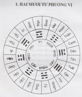 Trong môn địa lý người ta đem một vòng tròn chia ra 24 phần, đem 12 địa chi, mười thiên can bỏ đi hai can Mậu Kỷ không dùng (vì Mậu Kỷ đóng ở trung tâm) chỉ còn lại 8 can, 4 quẻ là Càn Khôn Cấn Tốn đem bỏ vào 24 phương vị này: