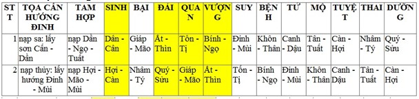 • 4 cung cát nhất dùng để nạp sa, thu thủy: Trường sinh, Lâm quan, Quan đới, Đế vượng