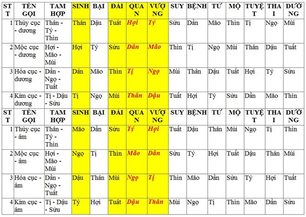 Lấy sơn của địa chi (dùng song sơn ngũ hành) của nhà cửa, hay sơn/hướng của mộ phần nạp vào tam hợp của địa chi mà lập thành 4 cục thủy/mộc/hỏa kim. Sau đó phân ra âm cục hay dương cục mà khởi trường sinh: