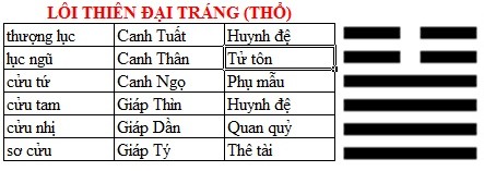 Lấy Càn long làm nội quái, lấy hướng Chấn (hoặc hướng Canh/Hợi/Mùi) làm ngoại quái được quẻ Lôi Thiên Đại Tráng.