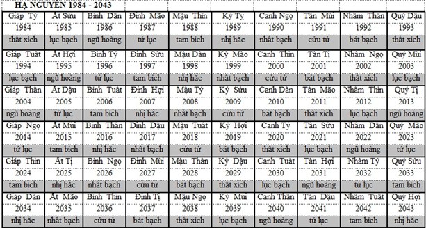 • cứ vào hạ nguyên, năm giáp tý khởi sao thất xích, năm ất sửu khởi lục bạch, bính dần khởi ngũ hoàng...