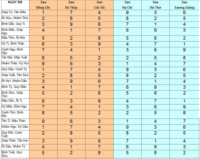 ý nghĩa của khẩu quyết nói trên là: muốn tìm sao trực nhật (nhập trung cung) của ngày phải dựa vào 24 tiết khí của năm, trong đó phân thành 6 mốc chính là Đông chí, Vũ thủy, Cốc vũ thì lần lượt khởi các sao Nhất bạch, Thất xích, Tứ lục nhập trung cung của ngày Giáp Tý đầu tiên sau tiết, thuận hành theo dương độn. Còn vào các tiết Hạ chí, Xử thử, Sương giáng thì lần lượt khởi các sao Cửu tử, Tam bích, Lục bạch vào ngày Giáp tý đầu tiên sau tiết, nghịch hành theo âm độn. Để dễ nhớ và dễ hiểu, ta xem bảng sau:
