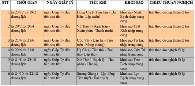 • cứ vào trung nguyên, năm giáp tý khởi sao tứ lục, năm ất sửu khởi sao tam bích, năm bính dần khởi sao nhị hắc...