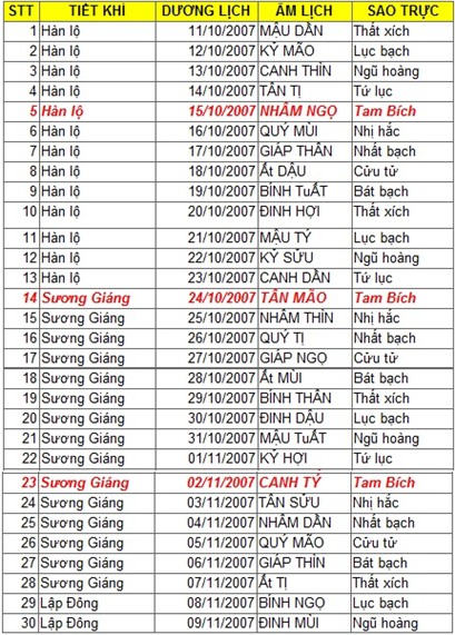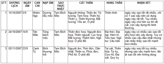 Xem biểu sao trực nhật từng tháng của năm 2007, ta thấy tháng 9 có sao Tam bích mộc nhập trung cung, và tra bảng sao trực nhật trong tháng 9, ta chọn được ba ngày dương lịch là 15/10 Nhâm Ngọ - 24/10 Tân Mão - 2/11 Canh Tý là các ngày có sao Tam bích nhập trung cung: