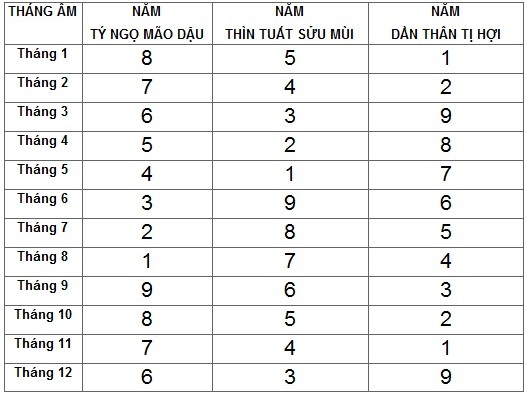 cách này theo chi năm mà tính, cửu tinh đi nghịch, theo bảng như sau: