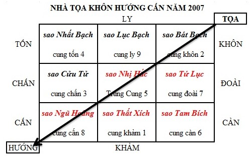 Nhìn đồ hình trên, ta thấy rằng năm 2007 có sao cát Bát Bạch đáo tọa, nhưng có sao hung Ngũ Hoàng đáo hướng là rất hung. Lẽ ra phải kiêng kỵ, nhưng nếu bắt buộc phải làm nhà trong năm này (do tình huống bắt buộc chẳng hạn), thì ta phải lập ra 9 đồ hình phi tinh để xem các sao cụ thể đáo sơn đáo hướng: