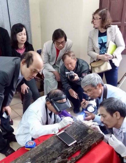 Các nhà nghiên cứu tìm tấm thẻ tre trong tấm ván địa của chiếc quách .