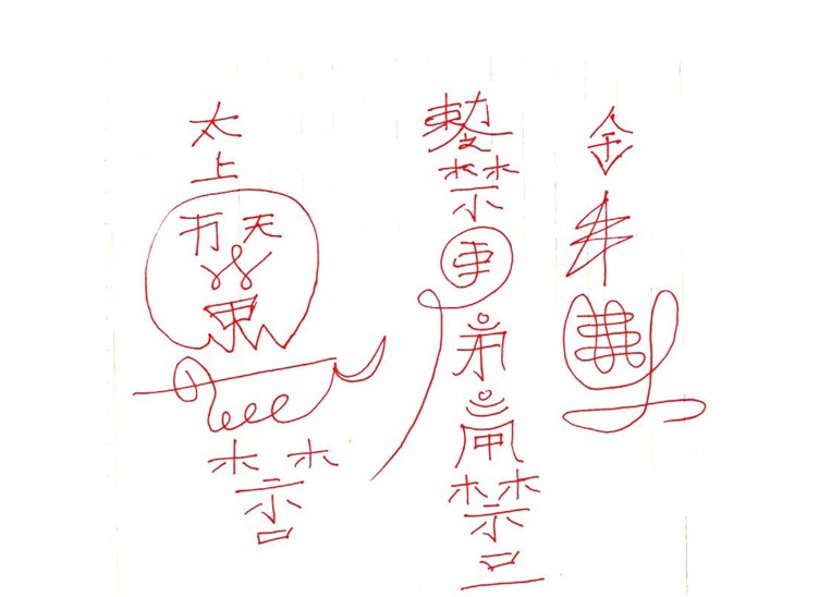 Chú* Sất Đốt, Hách Hách Dương Dương, Nhật Xuất Đông Phương, Ngô Sắc Thư Phù Phổ Tảo Kiết Tường, Khẩu Thổ Tam Muội Chi Hoả, Phục Hy Môn Tốc Chi Quang Tróc Quái, Sử Thiên Bồng Lực Sĩ Phá Tật, Đụng Uế Tích Kim Cang Giáng Phục Yêu Quái Hoá Vi Kiết Tường, Thần Binh Hoả Cấp Cấp Như Luật Lệnh Sắc.