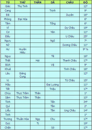 Giác, Cang, Đê, Phòng, Tâm, Vĩ, Cơ, Đẩu, Ngưu, Nữ, Hư, Nguy, Thất, Bích, Khuê, Lâu, Vị, Mão, Tất, Chủy, Sâm, Tỉnh, Quỷ, Liễu, Tinh, Trương, Dực, Chẩn.